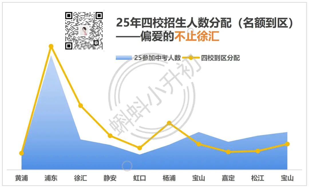 徐汇、杨浦直接断层领跑。 徐汇常规批次的四校录取率是2.45%,加上自招后,直接飙到了近4.2%;杨浦去掉自招后,四校率也能稳在2%-3%,仍旧是16区最高。 但奉贤四校率仅0.53%,青浦、金山、崇明齐刷刷卡在0.59%,差不多是徐汇的1/8。 名额到区是四校招生的主力军,2025年名额到区共1140个名额,较去年增加97人,占总招生计划的52.1%。 1140 个名额里,徐汇占比超12%,杨浦紧随其后,光是这两个区就分走了近23%的名额到区计划。 就算是浦东这样的人口大区,虽然拿到了约25%的名额,但架不住中考人数突破3万,分摊到每个考生头上的机会,其实远不如徐汇、杨浦。 除了徐汇和杨浦,静安由于众所周知的原因,一直是考四校相对低分的区,而虹口也一直是近年全市中考红利最大的区,而大家都想去的黄浦其实没啥红利。 郊区分到的名额,只能用稀缺来形容:崇明仅7个、金山16个、奉贤19个,三个区加起来还不到徐汇的1/3。 总的来说,上海四校招生并非盲目偏爱,而是基于生源质量、教育资源分布的选择。 市区的整体升学氛围更好,四校投放更多名额,可以高效筛选出适配的生源。 郊区的资源相对分散,升学竞争力偏弱,四校的名额投放自然 “吝啬”。 之前和一位嘉定的家长聊过,孩子对口的初中属于区内中等水平,近几年中考能考上四校八大的学生寥寥无几。 为了给孩子铺路,他们动了买房换区的心思,目标很明确:选一个户籍对口政策友好、优质初中集中的区,走 “人户一致” 顺位,挤进一所靠谱的初中。 看了户籍对口的几个区,实在是卷不动,想去普陀、黄浦又由于时间问题来不及办理学籍,于是放弃。把宝压在了摇号,好在最后摇去了一个不错的学校。