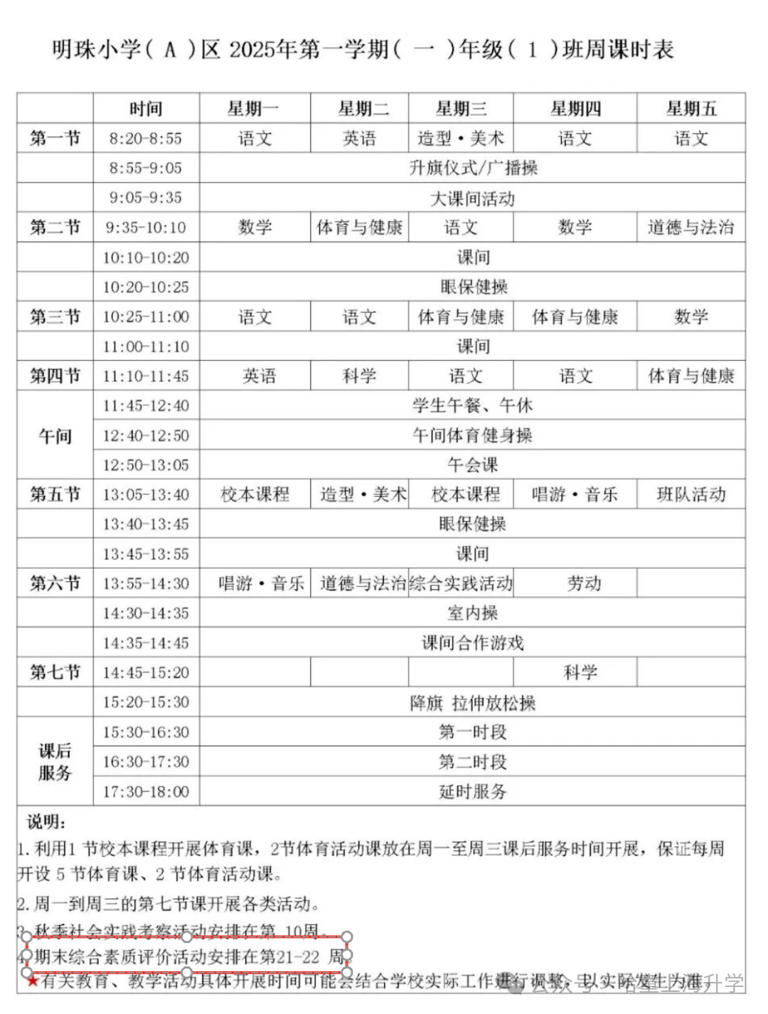 其中,也有多所中小学在课表安排中,标注了期末综合素质评价安排的时间。