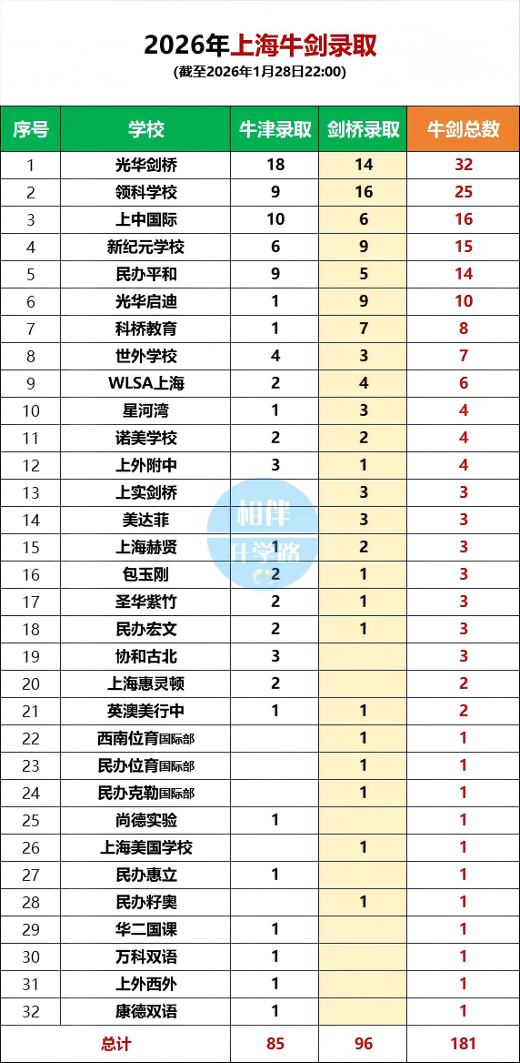 只看剑桥是不完整的。我们将两周前的牛津数据与今天的剑桥数据合并,这份“2026上海牛剑总榜”才是评价一所学校英国方向顶尖实力的终极标尺。