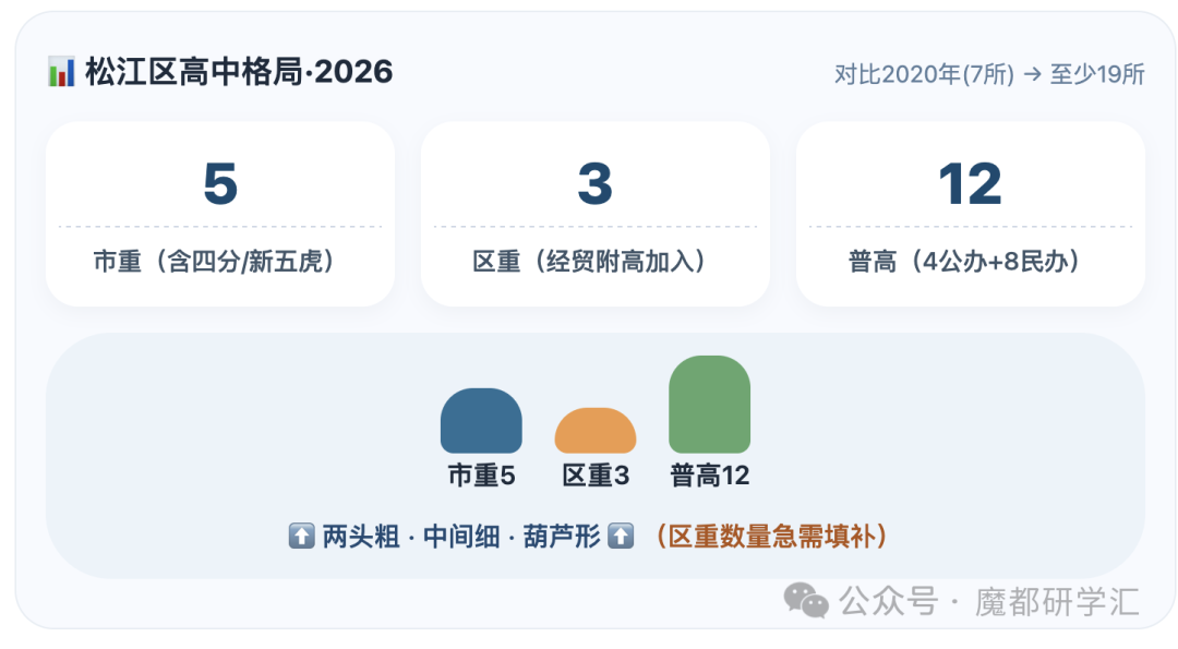 通常,一个地区的高中格局应该是金字塔型:市重最少,区重居中,普高最多。但松江区目前的分布却呈现出“两头粗,中间细”的葫芦状:头部市重和底部普高数量较多,而中间层次的区重却相对薄弱。这导致了一个直接问题:大量中等分数段的学生面临选择尴尬。
