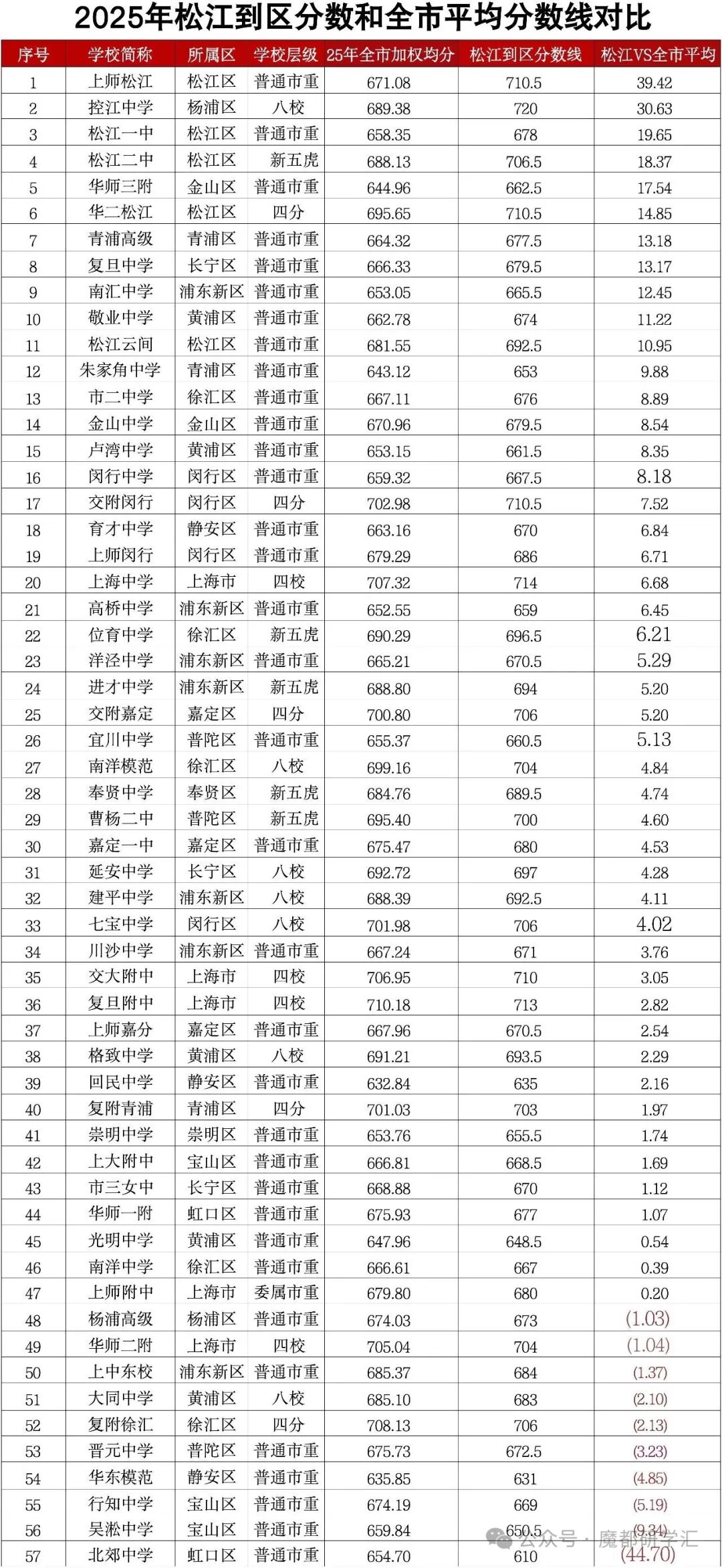 以2025年中考为例,松江区统一批分数线中,市重门槛线(松江一中)高达679.5分,仅次于闵行的闵中(685.5分),位列全市前列。而够不上松江一中的学生,只能滑落到下一梯队的华政松高(区重点),但华政松高招生体量庞大(近800人),几乎包揽了全区659-679分区间(2025年数据)的考生。这个分数段跨度大,学生水平差异明显,但可选择学校却非常有限。