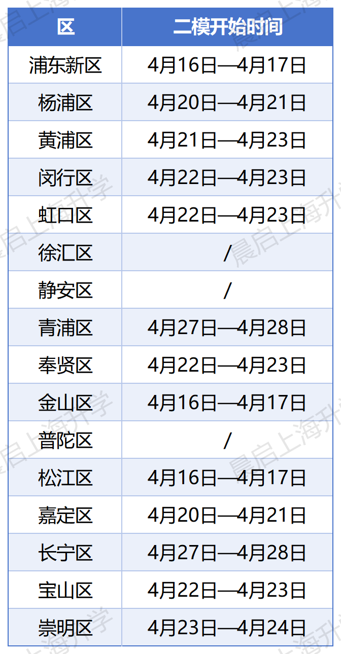 闵行区:已明确通知二模时间为4月22—23日,甚至在二模前还会安排一次月考,复习节奏不会受影响。 嘉定区:二模时间定为4月20—1日,且月考已经考了好几门,学生和家长心里其实都会有底。 杨浦区:月考已顺利结束,家长们正坐等二模,据悉二模时间已推迟至4月20日,并未取消。 普陀区:二模时间确定为4月27日,只是不再进行区级统批,也不搞区排名,形式上有所调整。 静安/徐汇/浦东:网传取消二模,目前暂未收到官方明确通知,具体以学校老师通知为准。 一开始传二模取消,那么引发讨论,是因为有些家长可能觉得,二模取消的话,就相当于少了一次区统考,就意味着少了一次检验孩子阶段实力的重要机会,给中考估分增加了很多难度。 但冯老师个人来看,即便真的没有区级二模,也会有校内期中考试,复习的节奏和重点并不会改变,家长和学生无需过度焦虑,跟着学校的安排稳步推进就行了。 不管怎么样,二模倒计时的钟声确实已经敲响,冯老师为大家简单汇总一下各区的二模时间: 注:部分区的时间可能会有细微出入,最终时间请以各校老师通知为准~ 在文章的末尾,冯老师要说的是,虽然有的区可能没有了名义上的二模,但大家还是注意进行估分练习。 毕竟,中考结束后的估分,它的准确性会直接影响大家是否能进入理想的学校! 清明假期是非常好的冲刺机会,冯老师相信大家只要稳住心态,跟着节奏复习,就一定可以在二模或期中考试中取得理想成绩的~