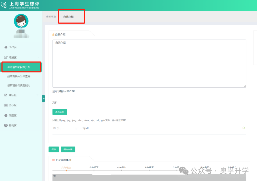 ①“自我介绍”仅限在九年级第一学期填写,500字以内;