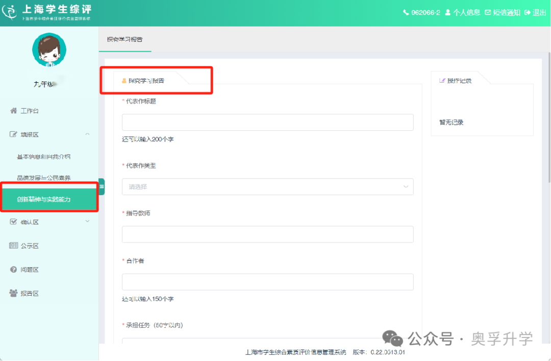 ②初中学生在初中阶段记录1篇最具代表性的探究学习报告、科学实验报告、社会考察报告或创新作品说明,四类中只要选择记录一项即可。