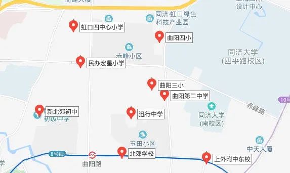 曲阳路街道周边的小学有虹口四中心小学、曲阳三小、曲阳四小;