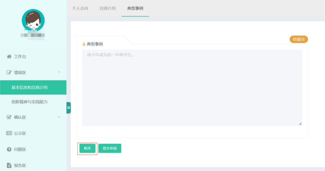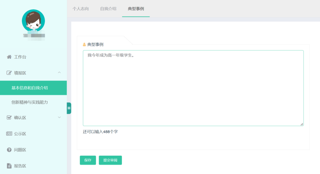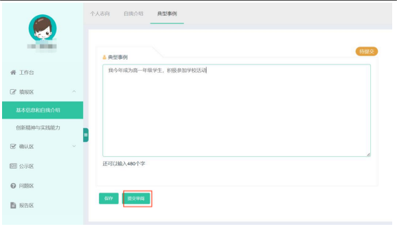 学生进入填报区——基本信息和自我介绍——典型事例,在输入框输入典型事例,最多输入500个字。填报完成后可点击“保存”按钮暂存,或点击“提交审阅”直接提交班主任审阅。