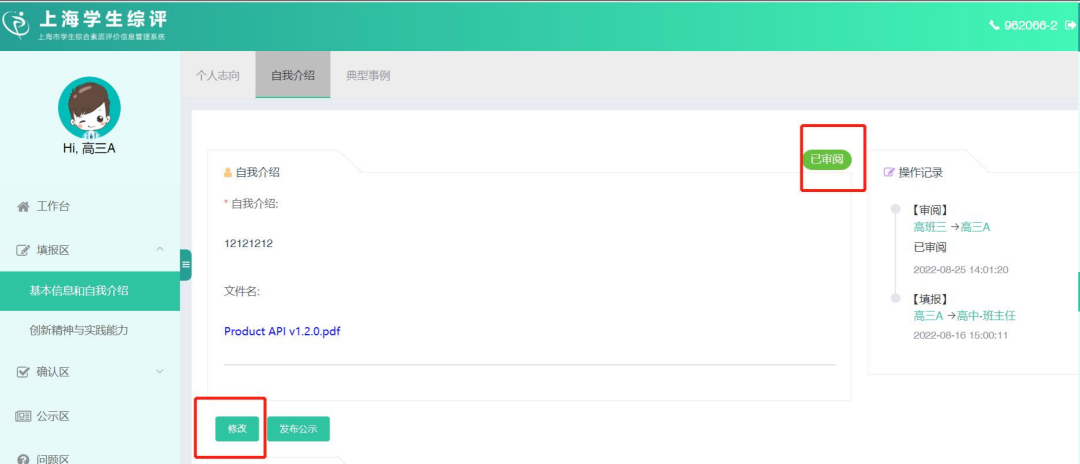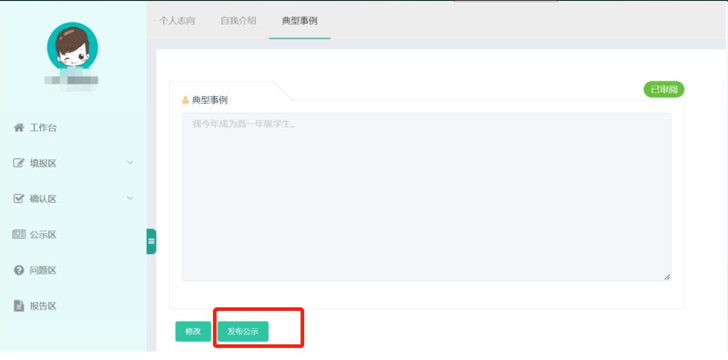 对于审核状态为“已审阅”的数据,可以在“操作记录”中查看班主任的审阅说明。如果典型事例无误,可点击“发布公示”按钮,数据发布成功。