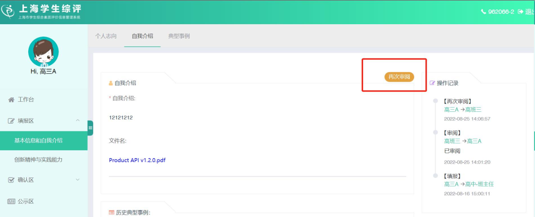 3、该数据填报情况变为“再次审阅”,等待班主任再次审阅。
