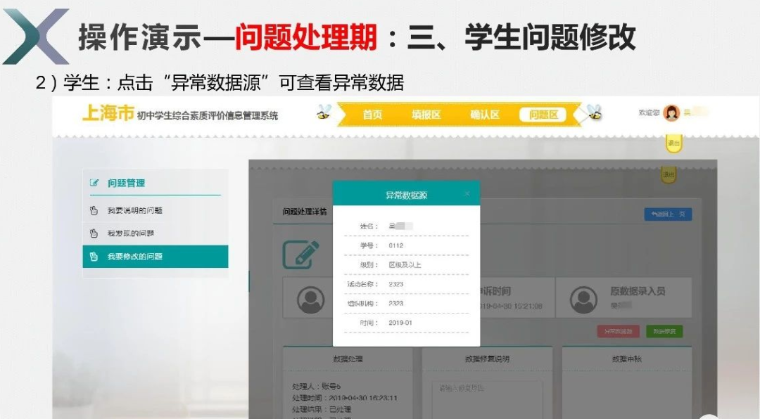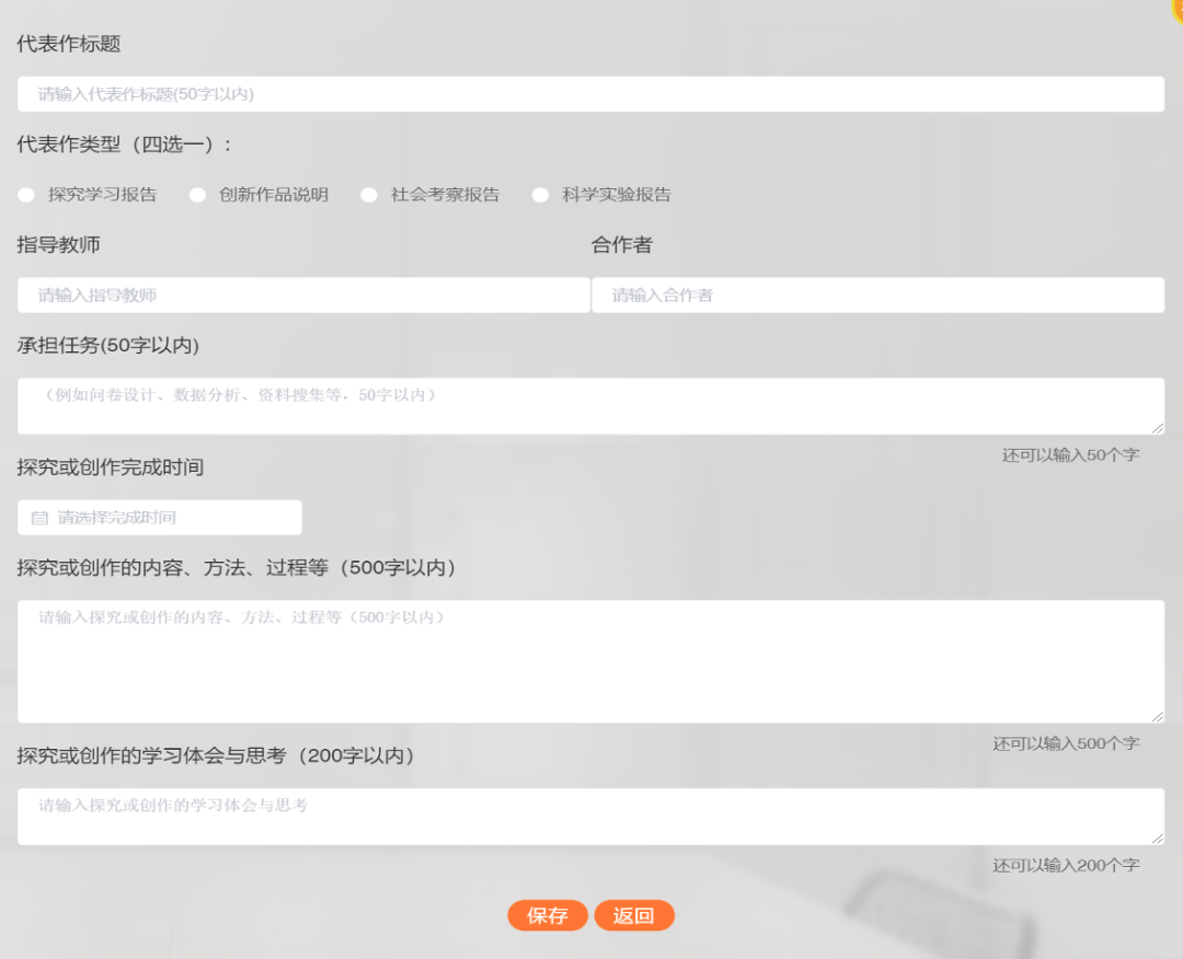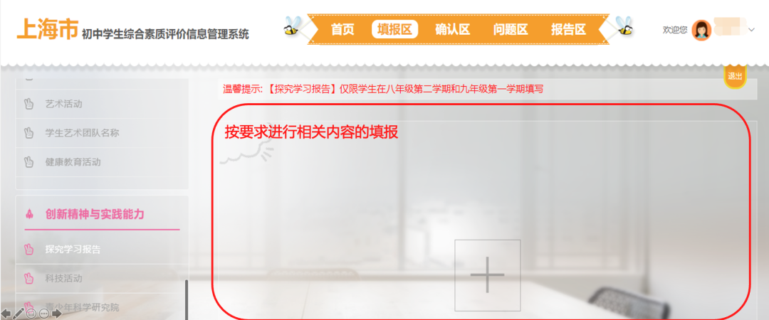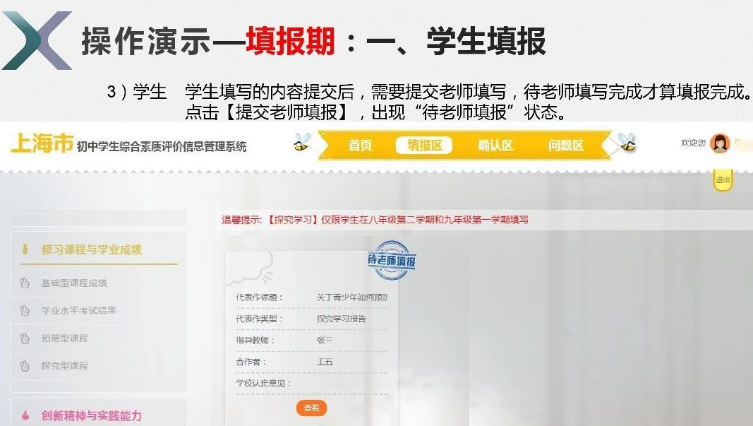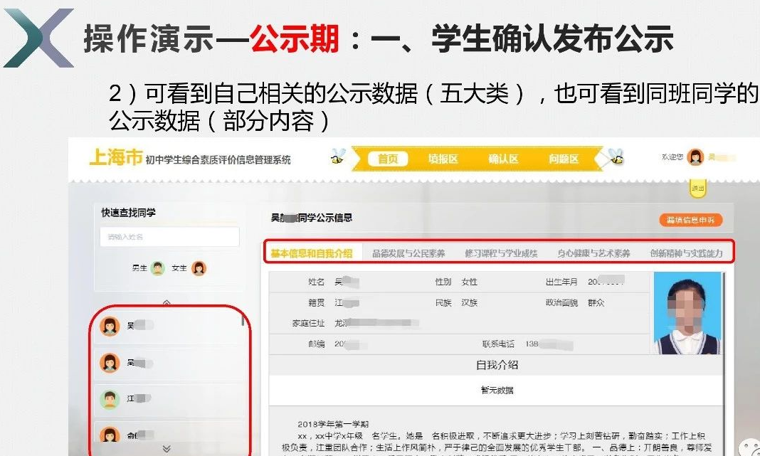 “基本信息和自我介绍”、“品德发展与公民素养”、“修习课程与学业成绩”、“身心健康与艺术素养”、“创新精神与实践能力” 自己填写:自我介绍,典型事迹 学校填入社会实践成绩,基础学科分数和评定 市区级奖项自动生成