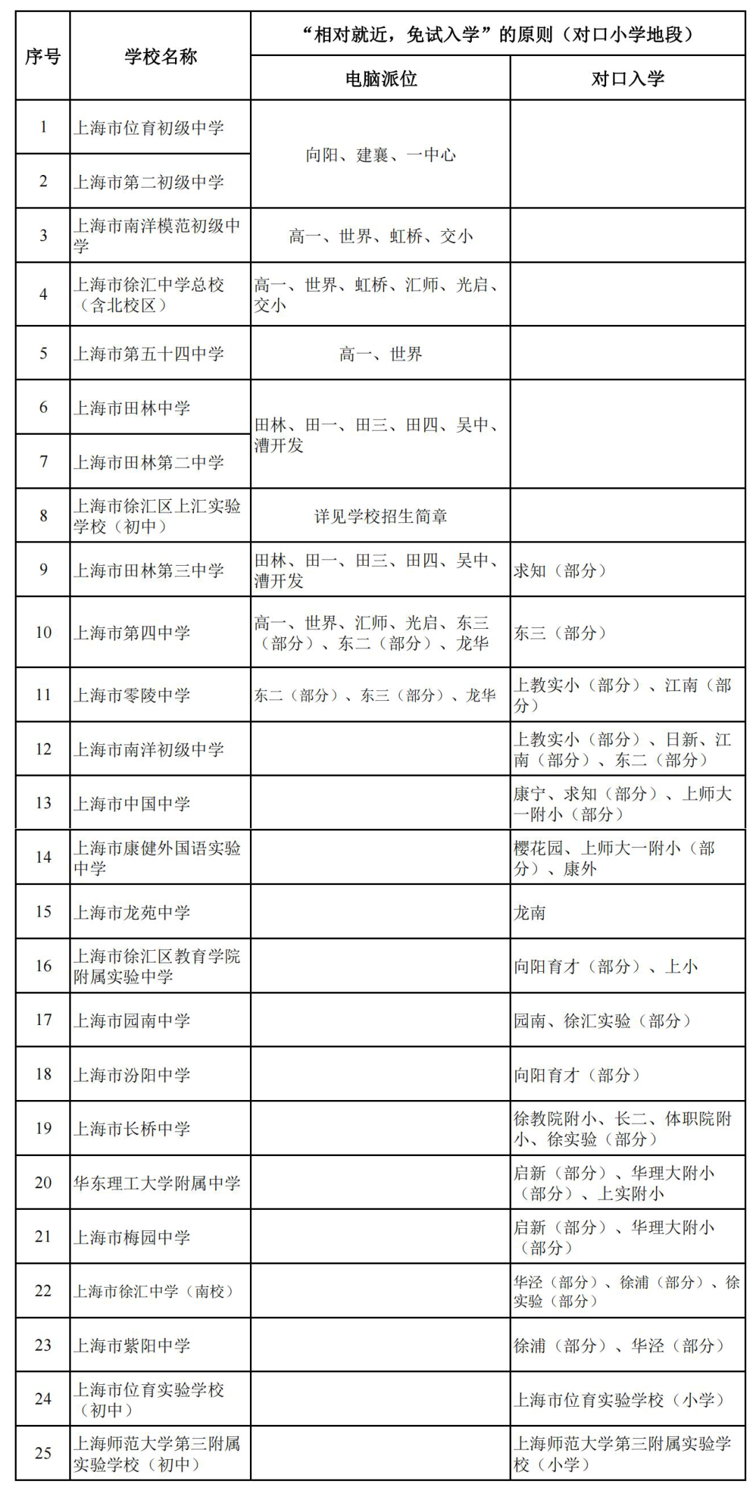 入学方式:序号1-8的入学方式为电脑派位;序号9-11的入学方式为电脑派位和对口入学相结合;序号12—23的入学方式为对口入学;序号24--25的为九年一贯制学校。对口原则:根据区内中小学设点布局的实际情况,相对就近均衡配置生源,实行部分划片电脑派位和部分对口入学相结合的初中入学办法。其他符合长宁区初中招生条件的学生,将根据登记入学人数和学校资源分布情况在区域内统筹安排入学。对口原则:公办初中学校招生采用相对就近小学对口或“电脑派位”等方法,小学毕业生免试入学。公办寄宿制学校(上海市回民中学除外)限在本区范围内招生。对口原则:公办初中采取小学对口、“电脑派位”等方式安排学生入学。