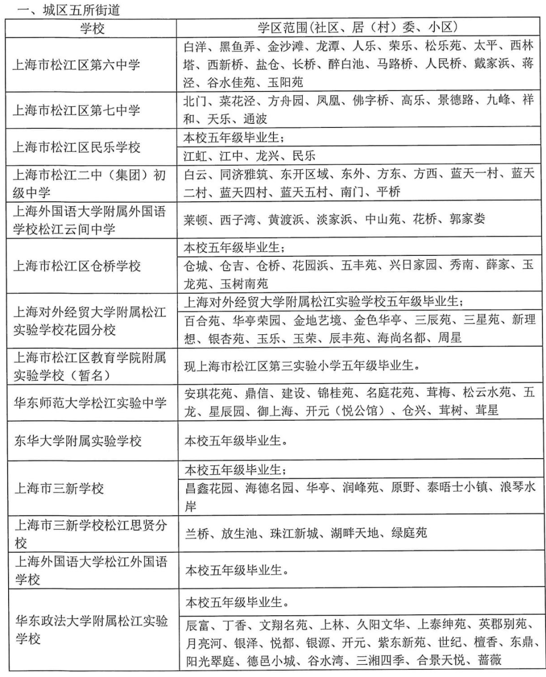 对口原则:本区从2021 年起对区域内入学矛盾突出的学校逐步实施 “每户房产地址五年内只享有一次同校对口入学机会(多胞胎、 多孩除外)”。不符合此项政策的适龄儿童和学生,由松江区教育考试中心统筹安排入学。特别告知:本区拟从2024年起实施“以户籍迁入年限排序”, 即“人户一致”对口入学人数超出学校招生计划数时,由原先按房产证年限排序调整为按户籍迁入年限排序。因教育资源补充和调整等原因,2023年松江区义务教育阶段招生区域范围有相应变化。说明:1、 以上公办初中六年级学区范围是依据本区教育资源、生源分布等基本情况,按“免试就近入学”原则进行划分。2、 具体安置办法详见《2023年松江区义务教育阶段学校招生入学实施细则》。对口原则:本区所有公办初中根据“免试入学”、学区对口原则,按照区教育局下达的新生名单和学籍材料进行招生报名工作。初中学校不得招收无学籍材料的学生。