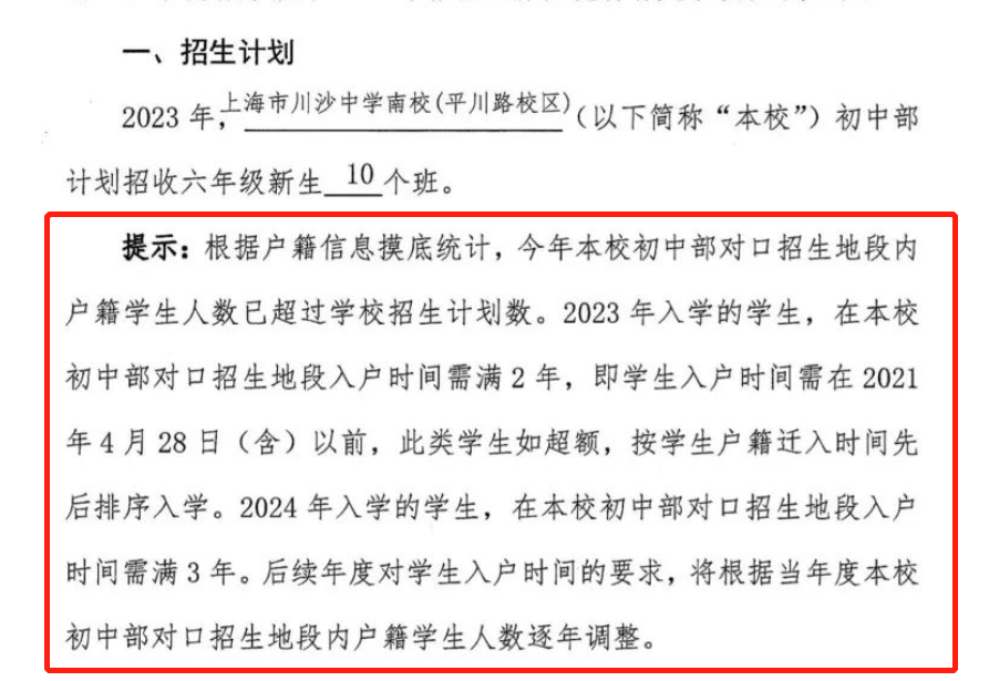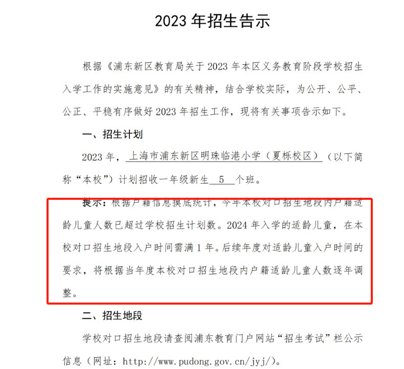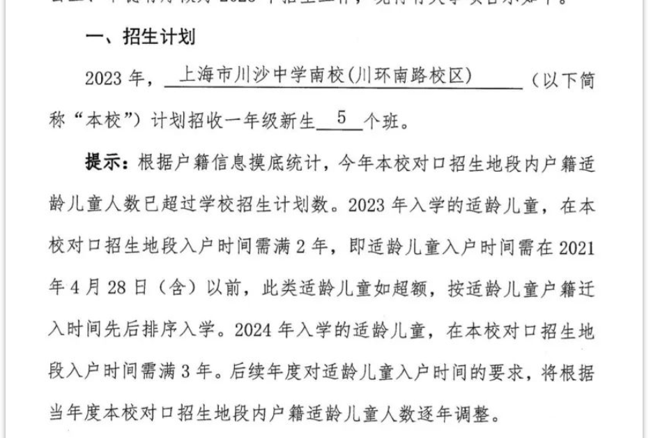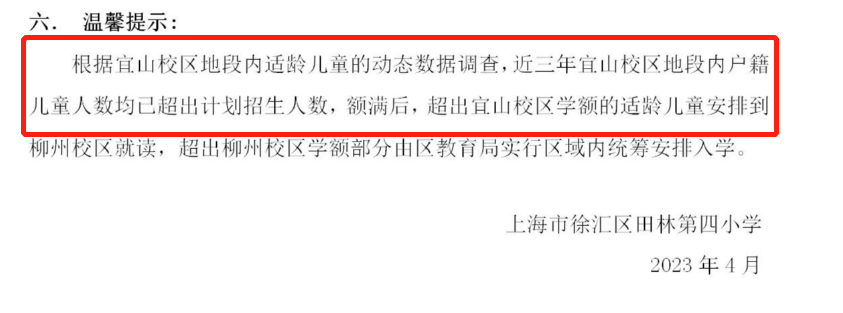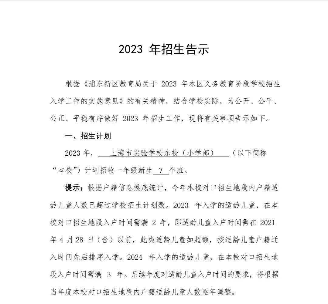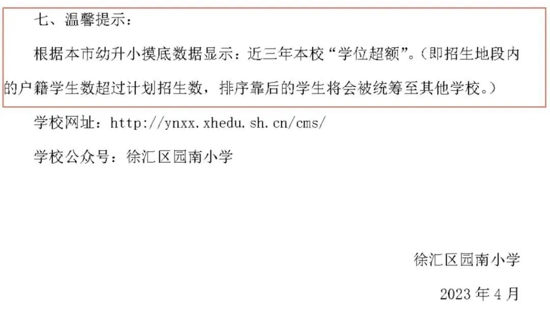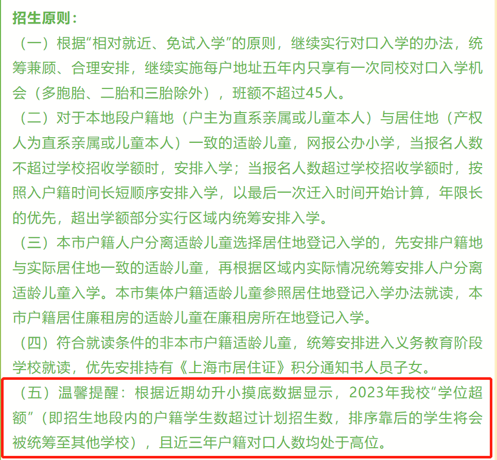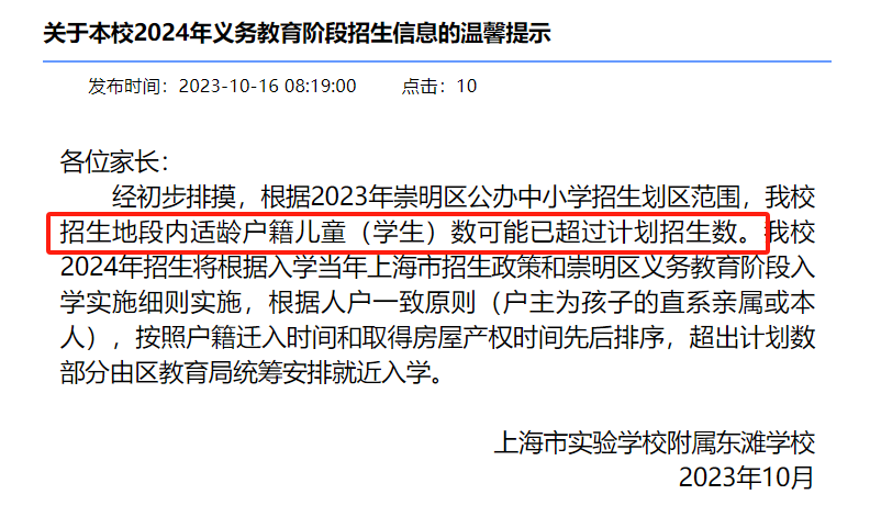 2023年10月,上实东滩首次发布了2024年学位预警。上实东滩位于崇明区是上实的托管校自创办以来办学质量深受家长认可而且它的招生方式有些特殊除了地段对口外还针对市内5区(浦东新区、杨浦区、宝山区、虹口区、静安区)摇号招生。本次发布超额预警也是崇明学校里,唯一一所发布学位预警的学校。上实东滩官网公告说明主要有2点:1、根据23年的招生情况摸排,对口范围内适龄学生可能超过学校的计划招生数;2、24年预计类似的情况会依然继续,所以学校会根据人户一致原则,按户籍迁入时间、取得房产权时间的先后,排序入学;
