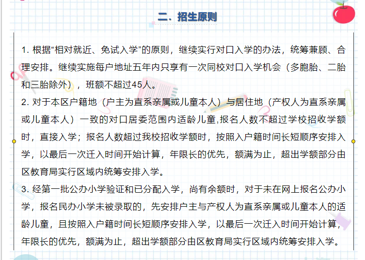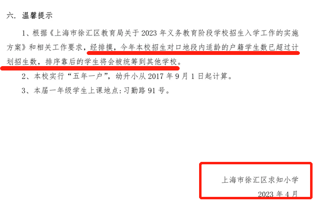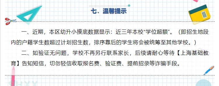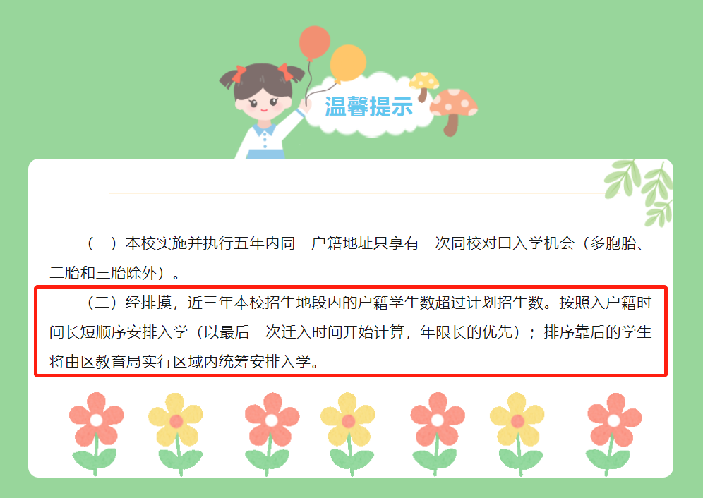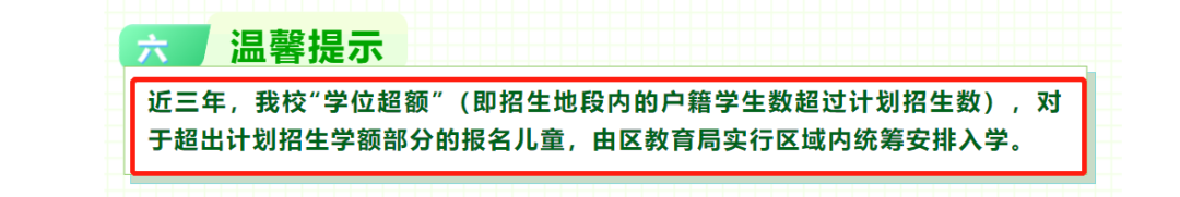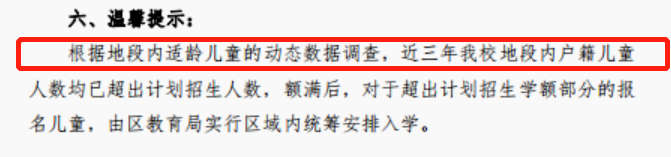 近期,本区幼升小摸底数据显示:近三年本校“学位超额”。(即招生地段内的户籍学生数超过计划招生数,排序靠后的学生将会被统筹至其他学校。)