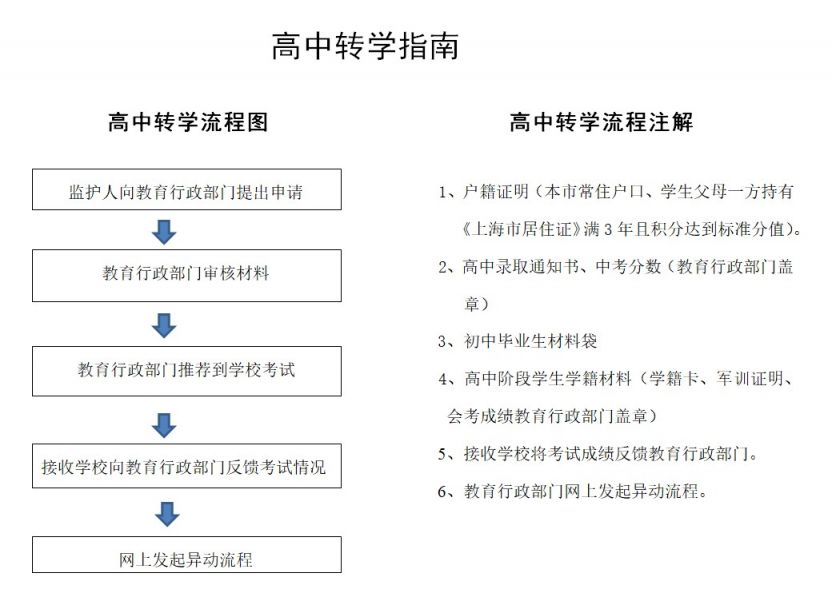 高中阶段:本区户籍在外省市就读的高中学生申请回本区就读或者学生父母一方持有《上海市居住证》满3年且积分达到标准分值,学校在有学额的前提下,经测试后,报区教育考试中心协调落实,方可办理转学手续。