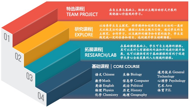三个特色班在加速学习基础内容(数、理、化实行双语双课本学习,一年半学完)的同时,各有侧重地推进专门课程与探究课程的学习,相当或略高于大学预科。