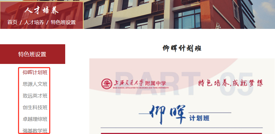 交附目前设立 仰晖计划班、思源人文班、致远英才班、创生科技班、卓越理综班 五种特色班。