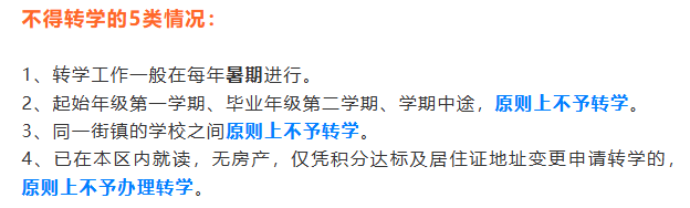 6. 不予转入的情况:起始年级第一学期/毕业年级第二学期/受处分期间/学期中途。(具体看各区政策)
