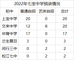 2022年七宝普通自招计划60人,艺体自招计划21人(并未录满)其中上宝中学和文来中学这两所“亲儿子”都有20人预录,华育中学则有17人预录,这三所学校构成了七宝中学的主要自招生源。