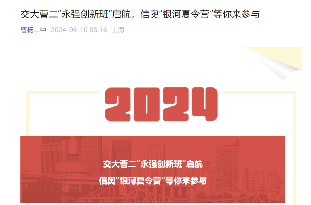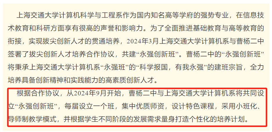 从2024年9月开始,曹杨二中与上海交通大学计算机系将共同设立“永强创新班”,每届设立一个班。
