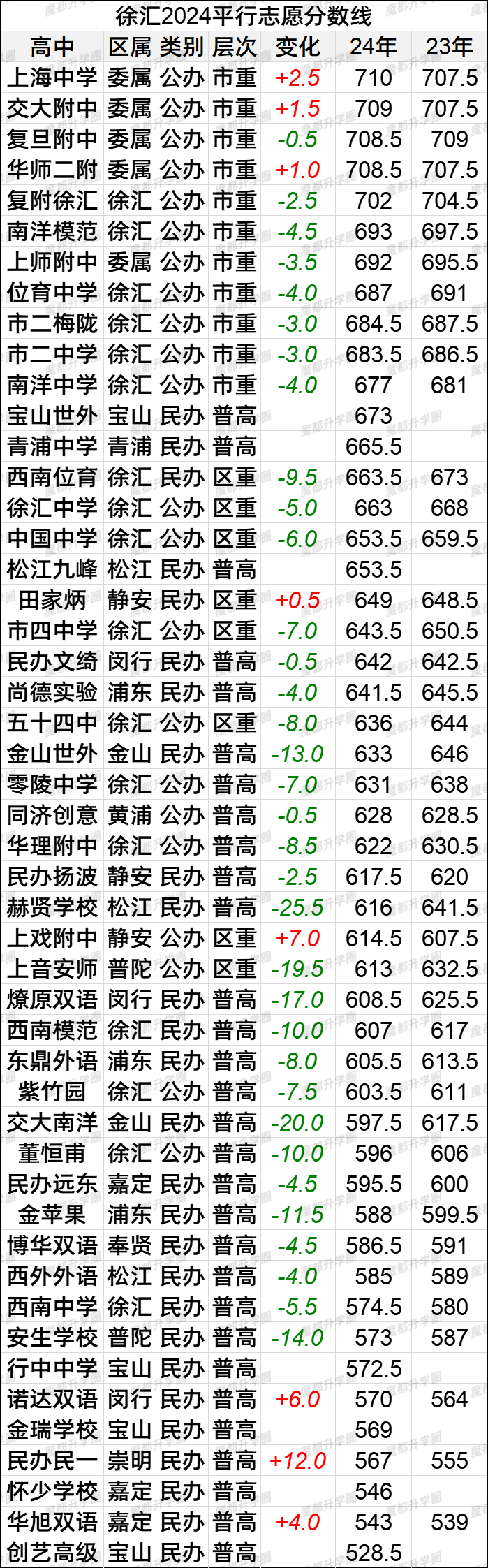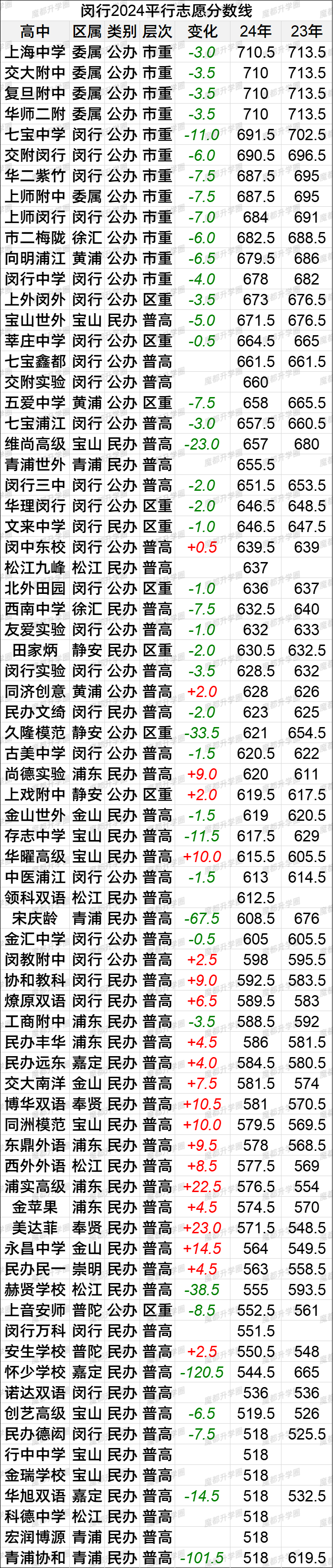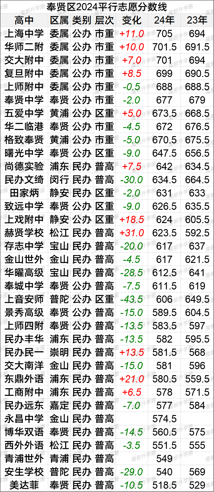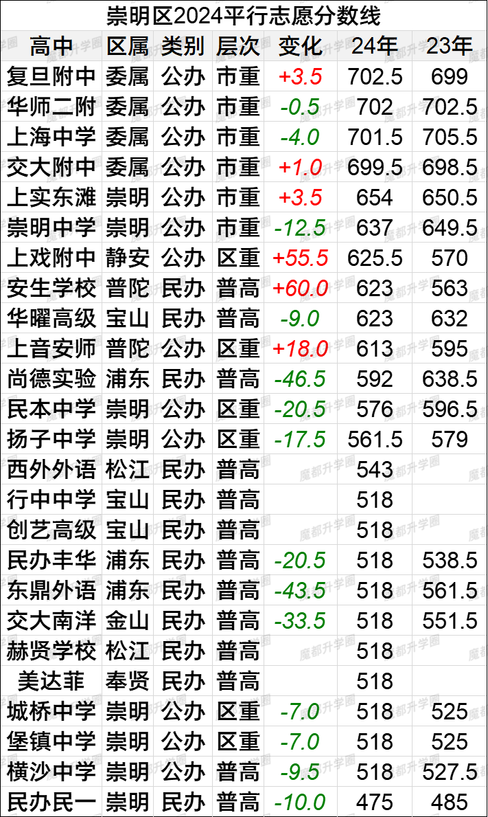 2024上海中考16区平行志愿分数线vs2023