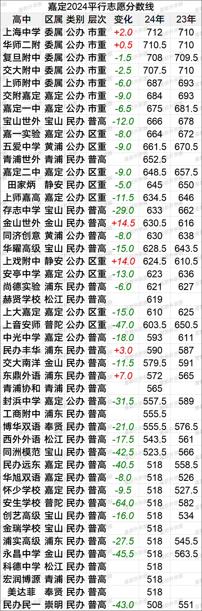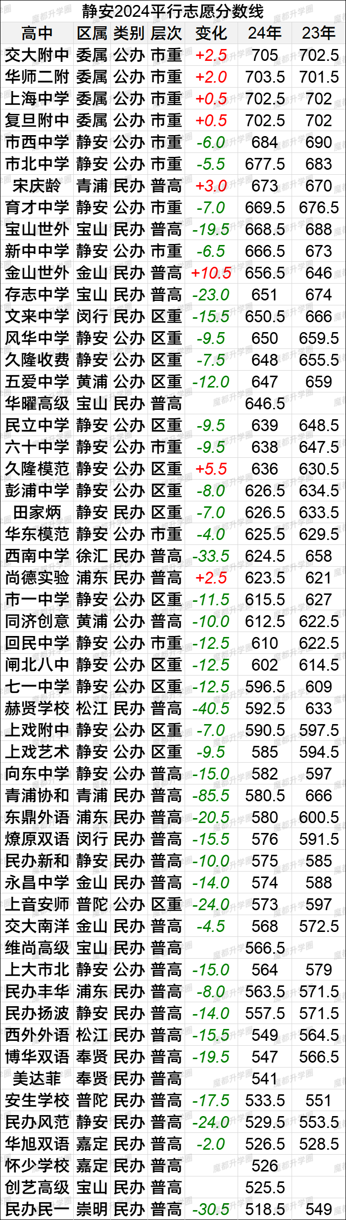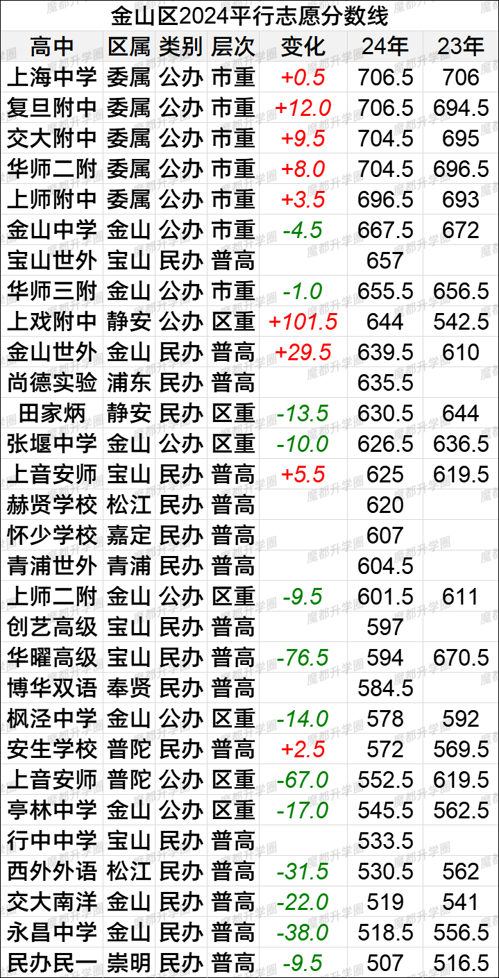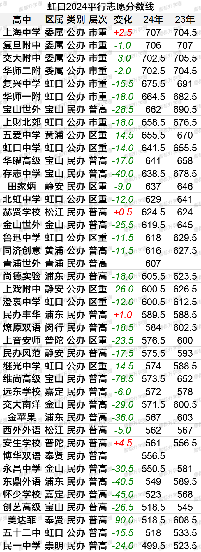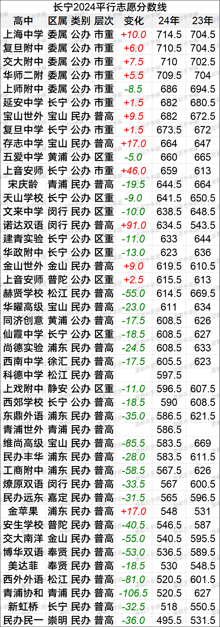 2024上海中考16区平行志愿分数线vs2023
