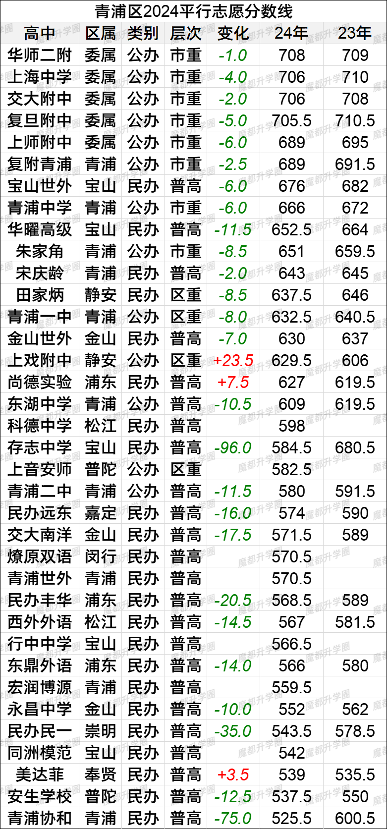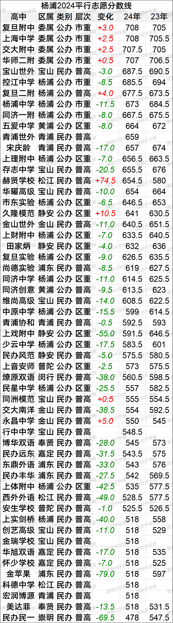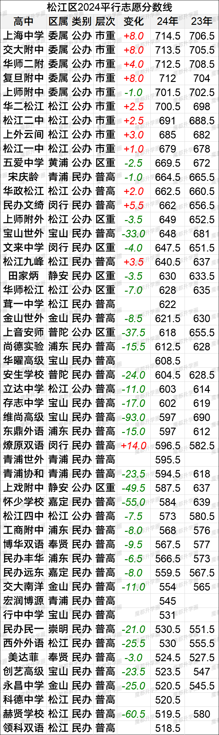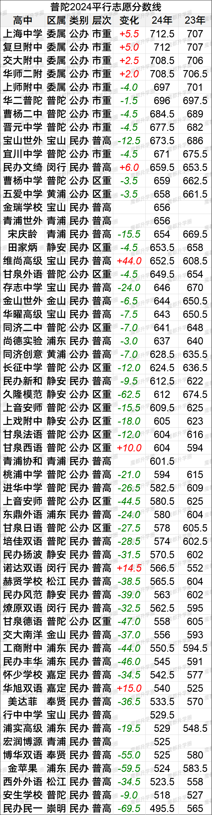 2024上海中考16区平行志愿分数线vs2023