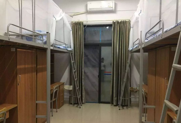 ●宿舍是标准的4人间,但经常会出现只住3个人的情况,因此空间相对充裕。房间内配备了全木制的上床下桌,4个书架,3个抽屉以及1个大型衣柜,空间完全够用。此外,宿舍内还有独立卫浴,24小时热水供应,空调和阳台。每层楼都有大型饮水机和2台洗衣机供使用。学生需自己整理个人内务及卫生,住宿不得携带iPad等电子产品,不得携带纸牌、桌游等。