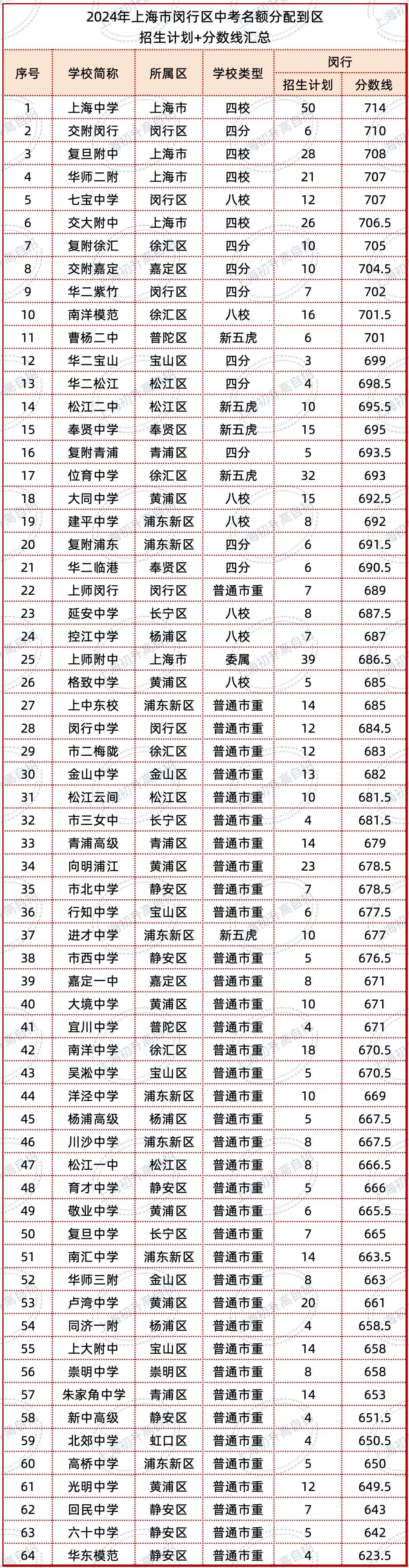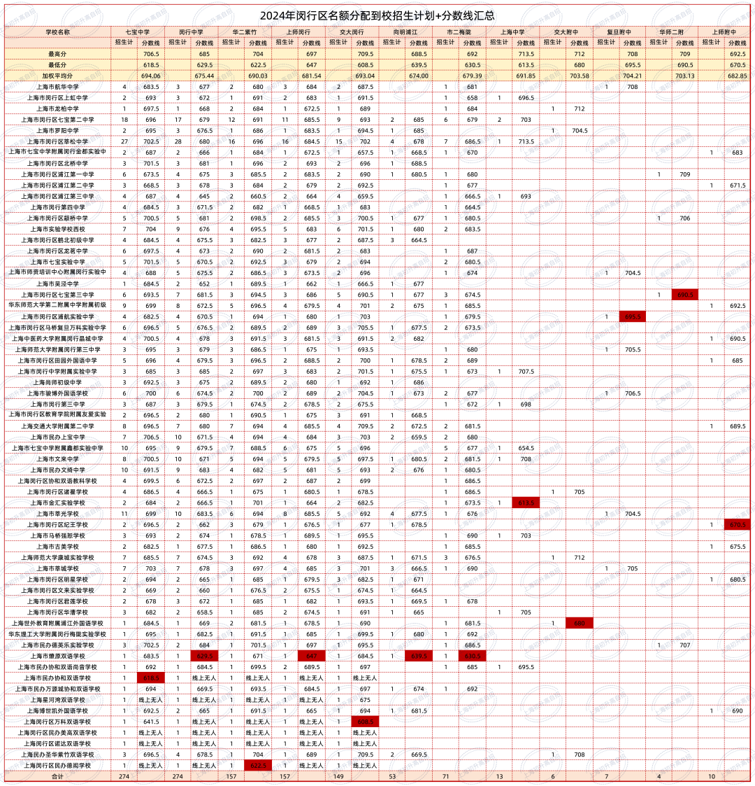 2024年,在名额分配到区批次共有64所市重在闵行区招生,闵行本区的交附闵行710分,七宝分数线707分,超过了部分四校;