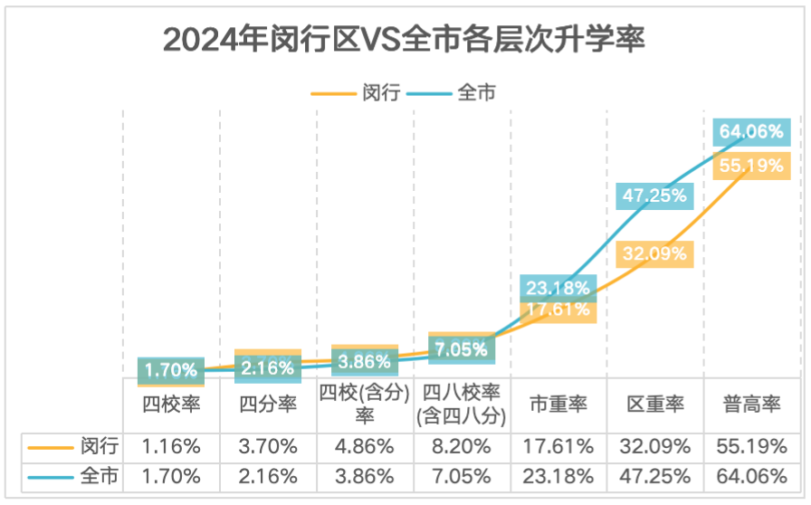 闵行区的头部升学率非常能打,从四校率到四八校率,都全面高于全市水平。确实顶尖的优质市重,是非常乐意在闵行区招生的,因为闵行区的考生,总是能交出满意的分数线;