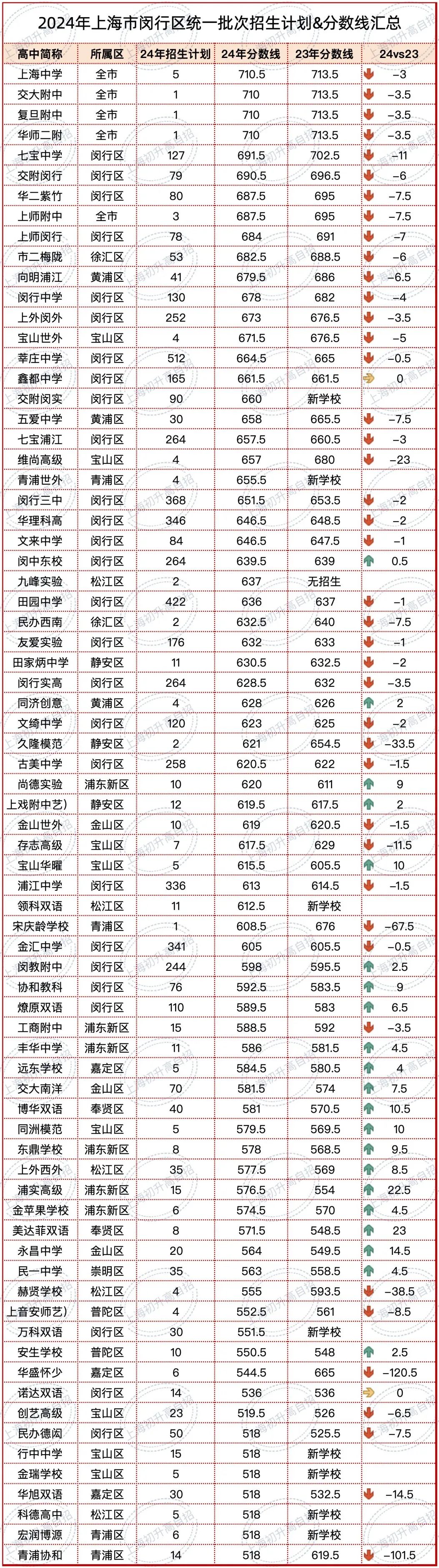 这并不代表四校在闵行区的分数线低,实际上还是非常高的,只不过是因为2023年闵行区四校的分数线均为713.5分,高出其他区5分以上,所以今年呈现下降趋势。
