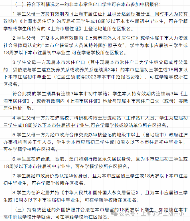 8.学生为在沪定居并持《中华人民共和国外国人永久居留证》,且为本市应届初三学生或18周岁以下本市往届初中毕业生,可在学籍学校所在区报名。
