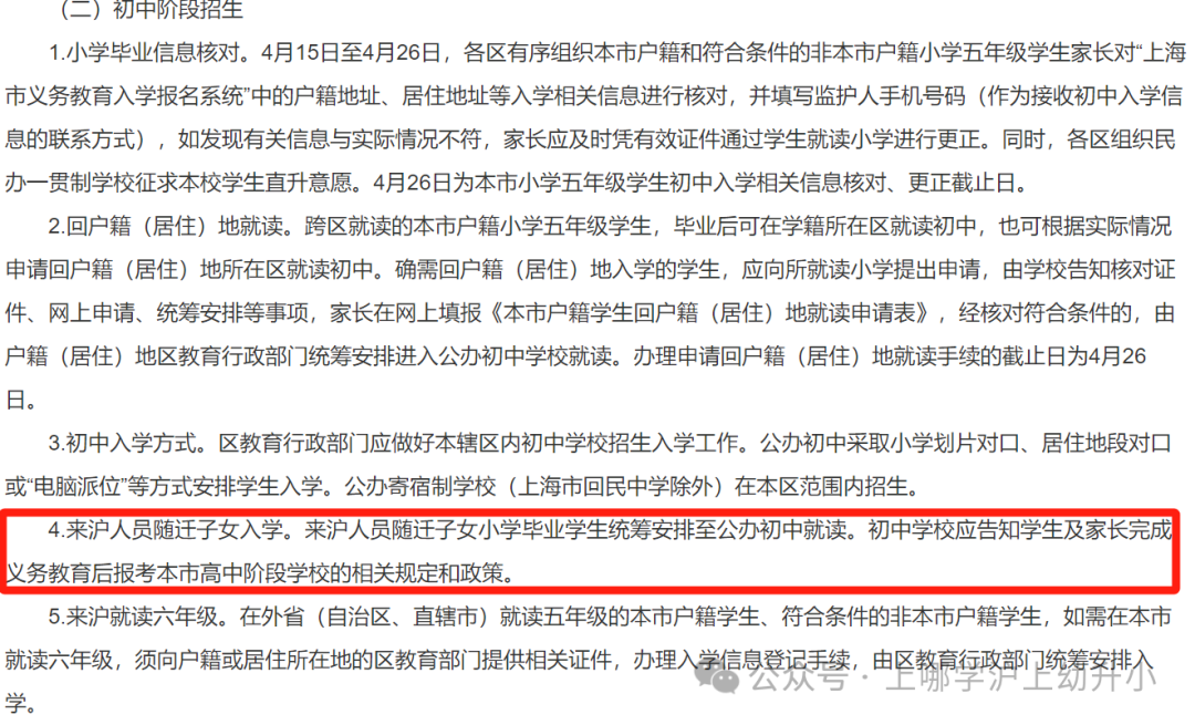 ①、来沪人员随迁子女入学。来沪人员随迁子女小学毕业学生统筹安排至公办初中就读。初中学校应告知学生及家长完成义务教育后报考高中阶段学校的相关规定和政策。
