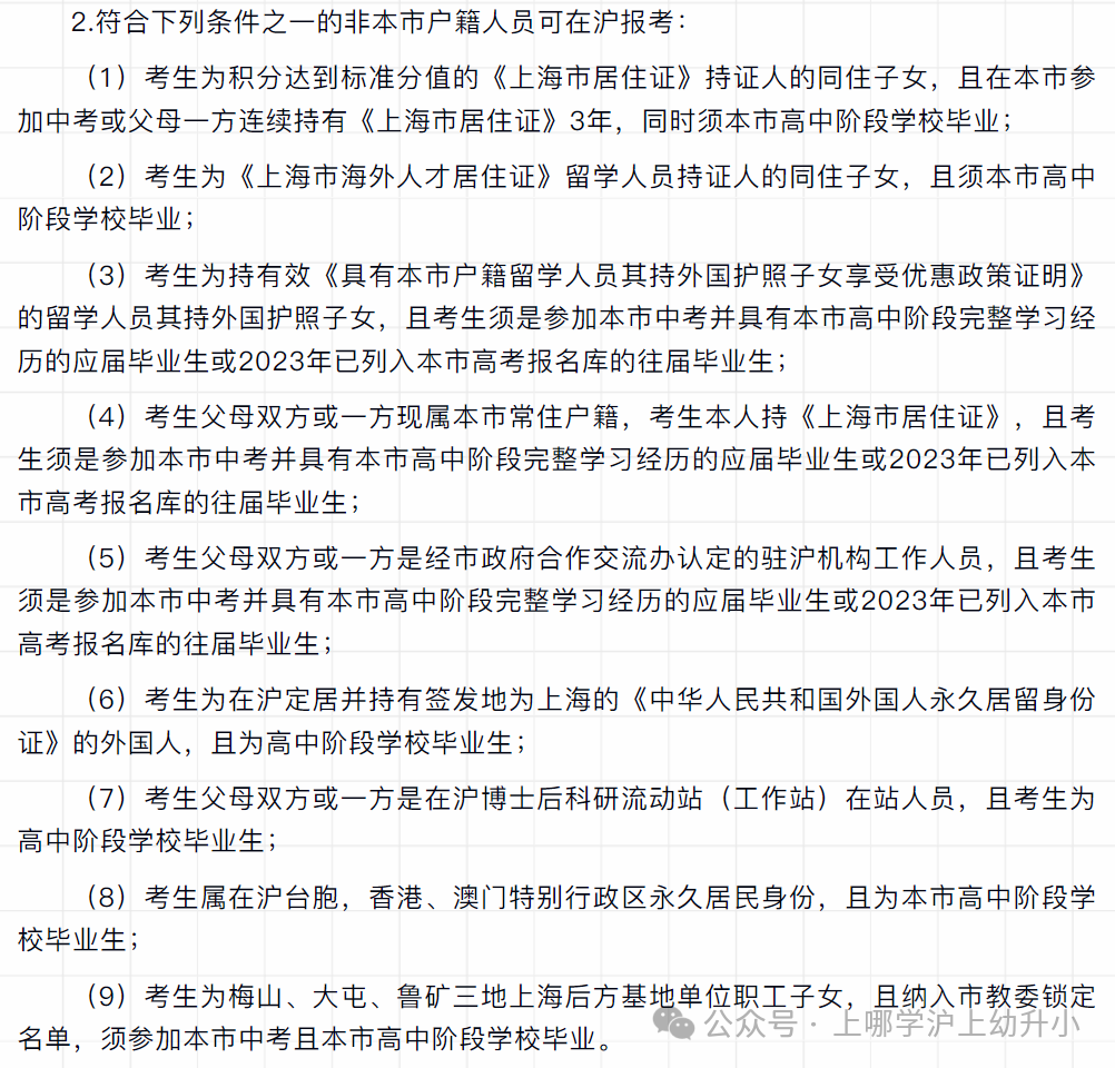 根据《上海市教育委员会关于做好2024年上海市普通高校考试招生报名工作的通知》的要求,明确了2024年可以在上海参加高考的9类非沪籍考生的条件→