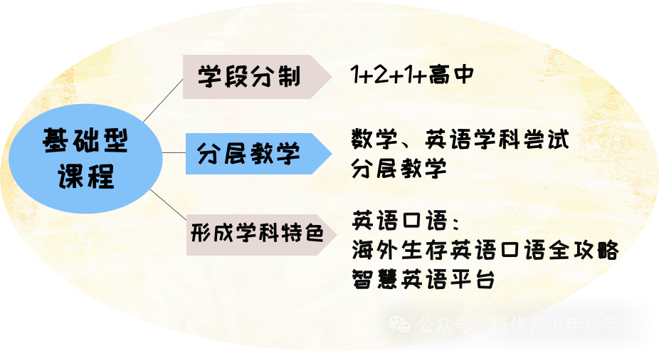 基础型课程:严格按照国家课程标准,开足开齐各类基础型课程,包括语文、数学、英语、物理、化学、道德与法治、历史、地理、体育、音乐、美术等,确保学生在基础知识和基本技能方面得到全面的培养。