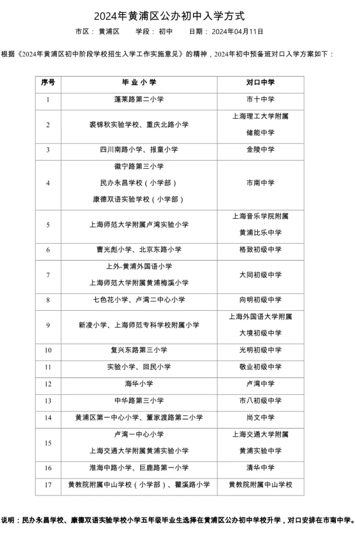 2024年黄浦区公办初中预备班入学方式