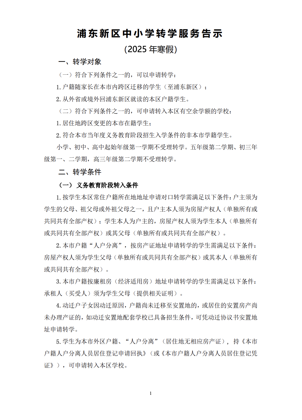 就在刚刚,浦东新区发布了2025年寒假转学政策,这次的申请时间仅为2025年1月2日,1月3日两天!