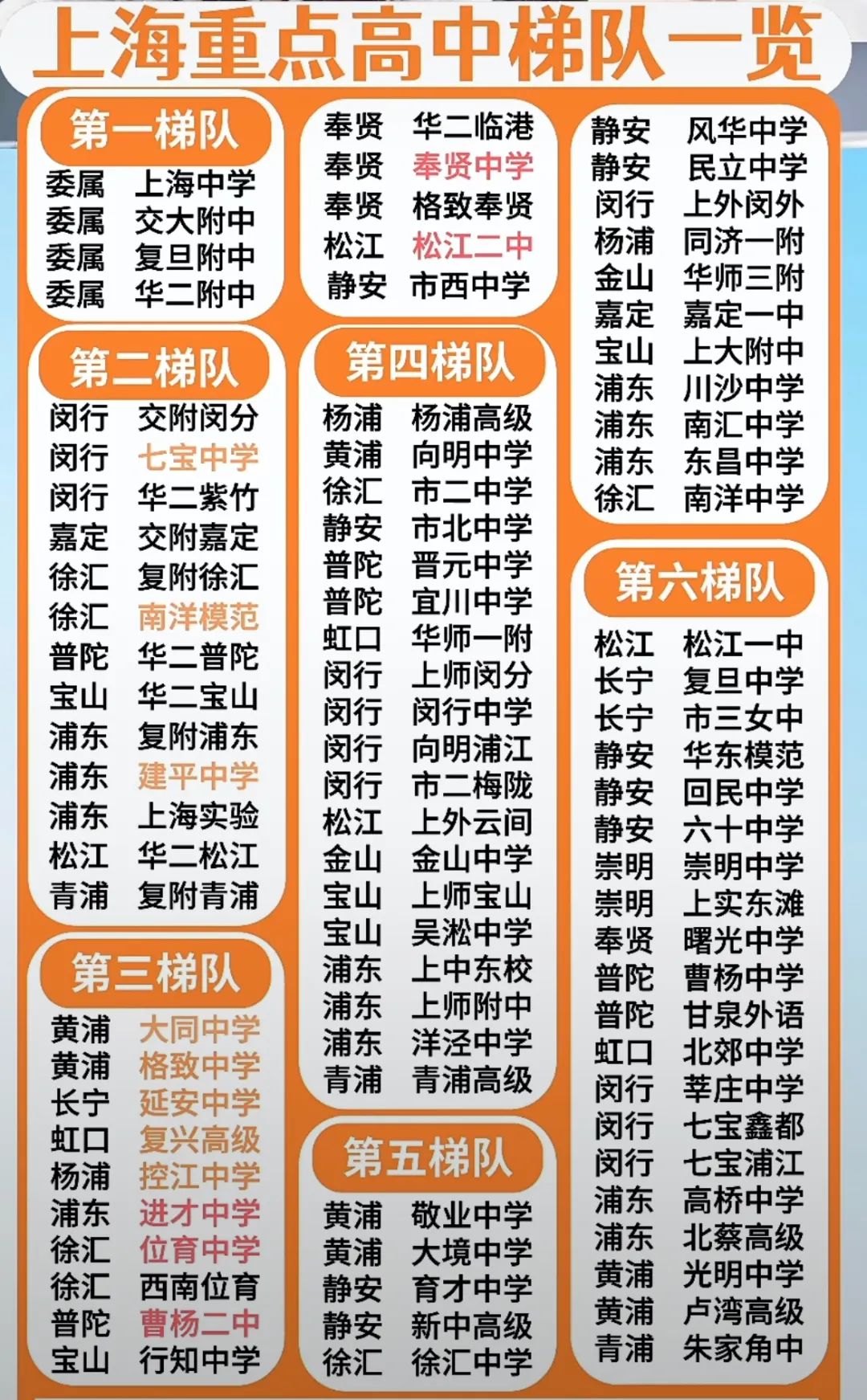 南洋模范中学、格致中学、大同中学、控江中学、七宝中学、延安中学、建平中学、复兴高级实验中学。