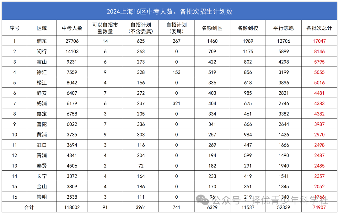 1、上表自招的录取批次是本区高中对于全市的名额,非仅给本区的名额;