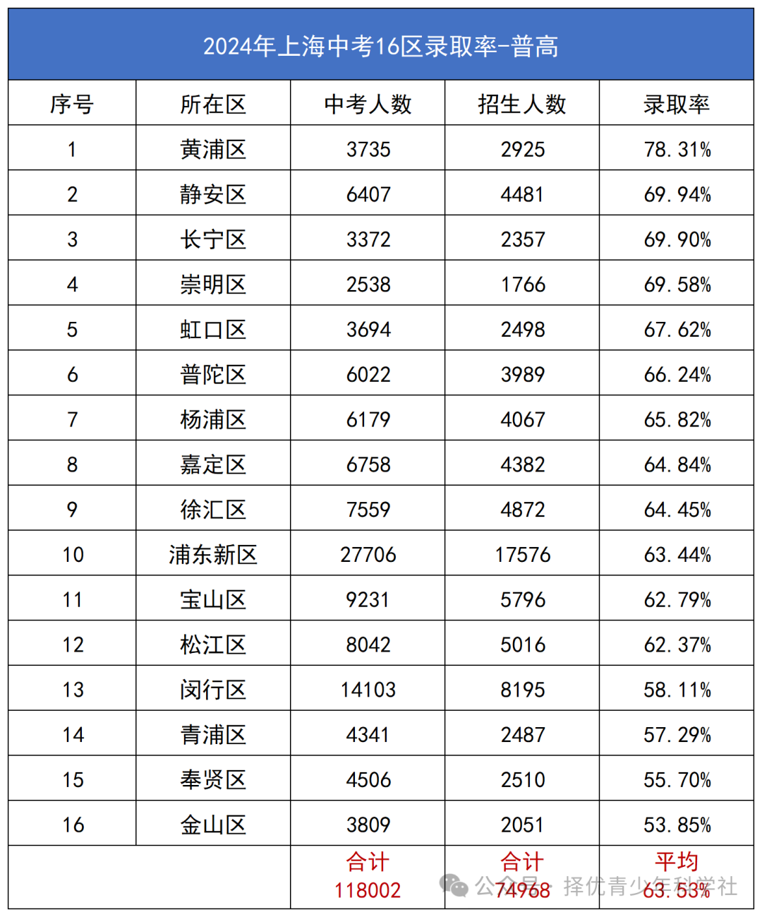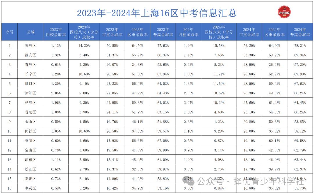 上海16区普高(及以上)录取率排名前三的是:黄浦,静安,长宁。而录取率最低的倒数三位是:青浦,奉贤,金山