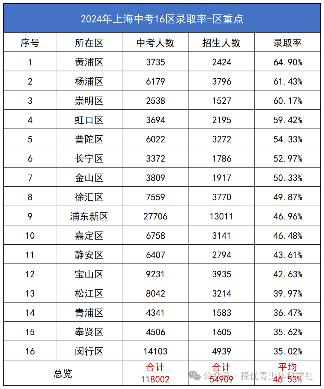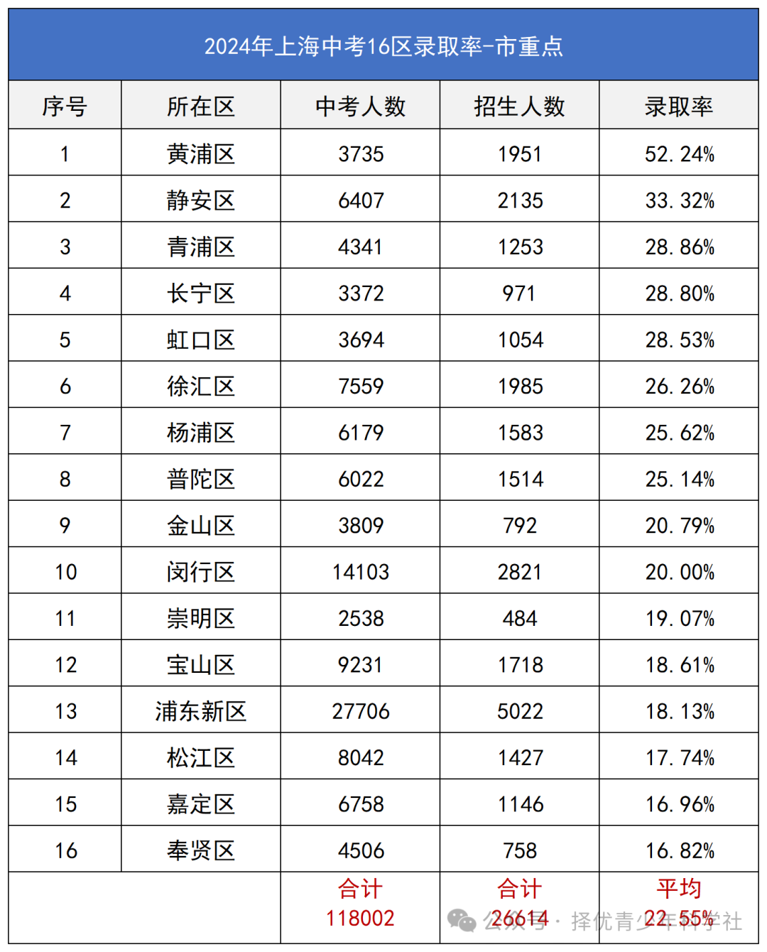 上海16区区重点(及以上)录取率排名前三的是:黄浦,杨浦,崇明。而录取率最低的倒数三位是:青浦,奉贤,闵行。