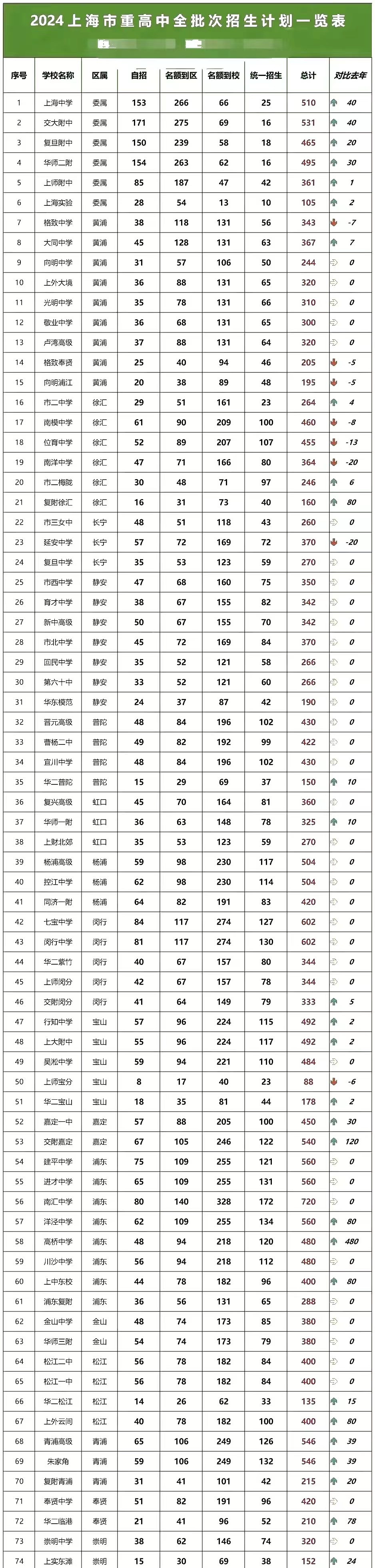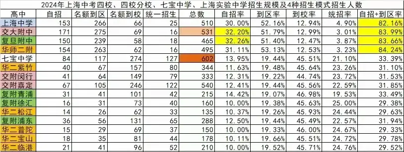 74所重点高中不同模式招生计划人数、自主招生率(全市中考生共同竞争),自主招生率最高的4所高中分别是复旦附中的32.26%、交大附中的32.2%、华师大二附中的31.11%、上海中学的30%。七宝中学的自主招生率13.95%。