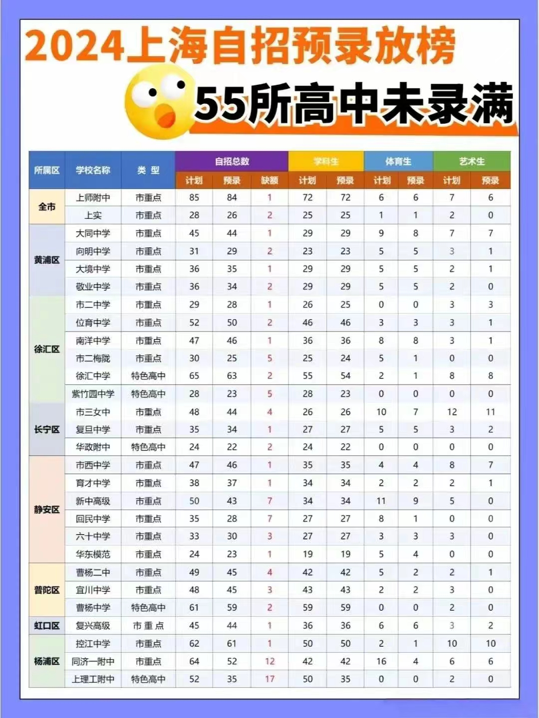 36所高中完成自主招生录取计划,55所高中未完成自主招生录取计划。