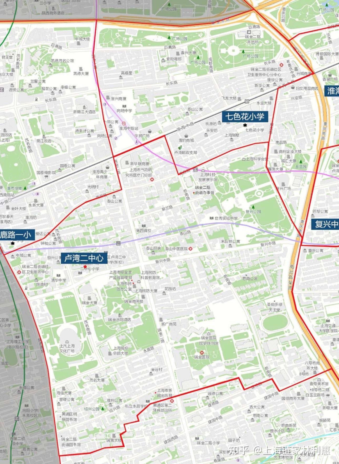 上图为七色花小学和卢湾二中心对应的学区范围。