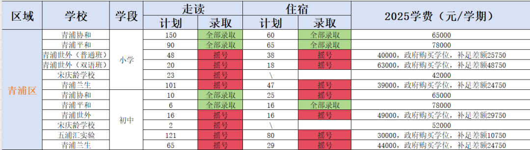 青浦平和,走读计划招生90,住宿计划招生65,全部录取。