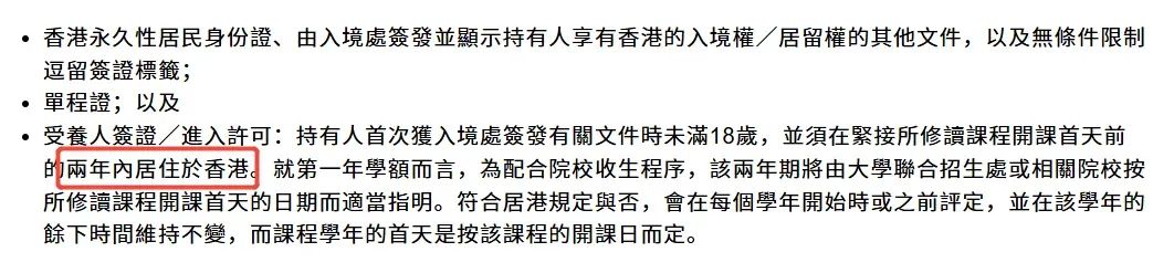 受养人签证,且来港时未满18岁,并在开学前的两年内居住在香港。
