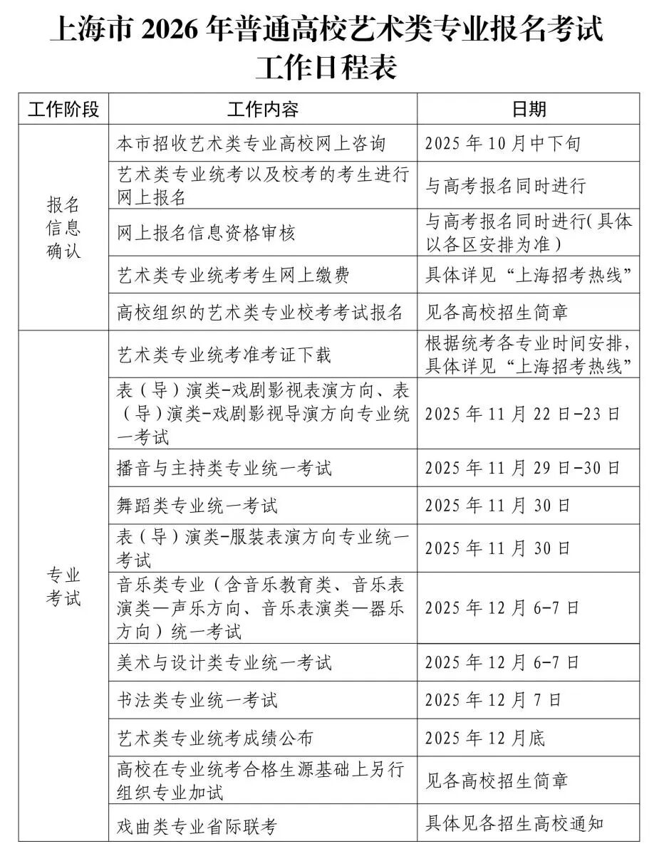 为方便考生了解2026年艺术类专业统一考试招生相关政策,上海市教育考试院将在2025年10月中下旬开展上海市2026年普通高校艺术类专业考试招生网上咨询。具体安排届时以“上海招考热线”公告为准。