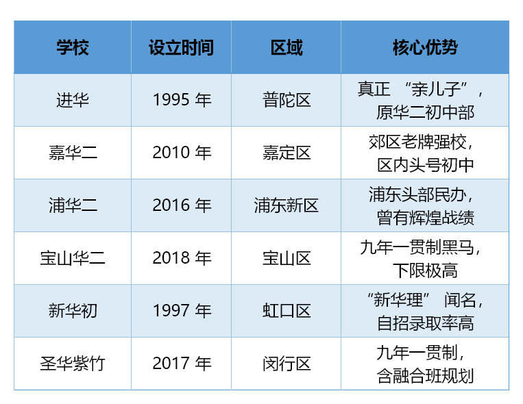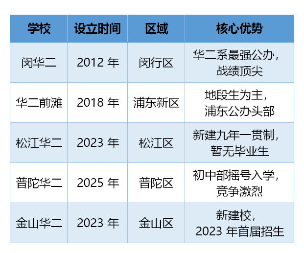 在嫡系初中部方面,华二系可谓“开枝散叶”,上海几乎一半的行政区都有华二系的初中存在,甚至有很多校区都直接延伸到周边地区。