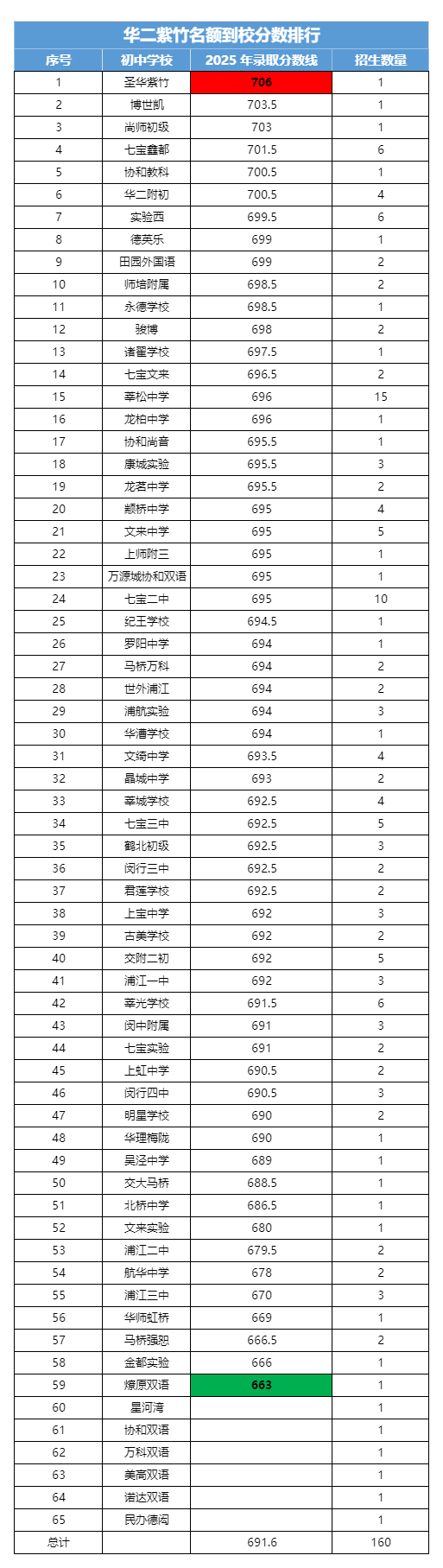 华二紫竹名额到校最高是圣华紫竹的706分,最低为燎原双语的663分,差值43分。