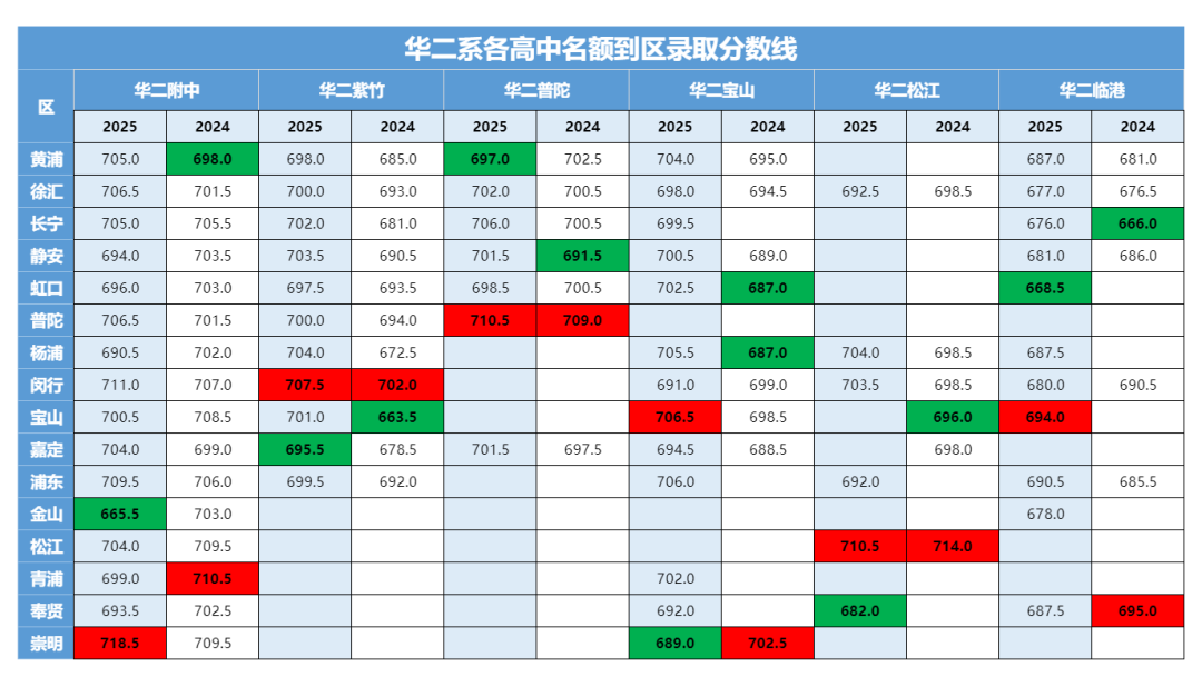 华二紫竹名额到区最高分为闵行的707.5分,最低为嘉定的695.5分。
