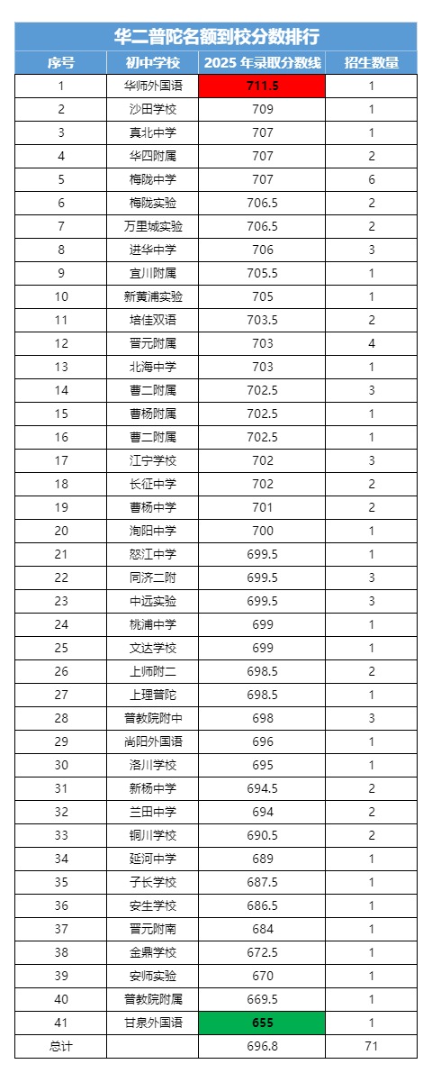 华二普陀名额到校最高是华师外语的711.5分,最低为甘泉外语的655分,差值56分。
